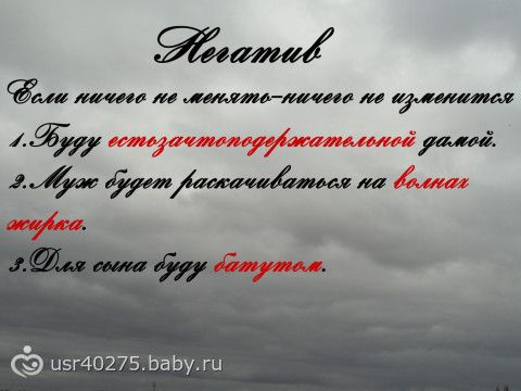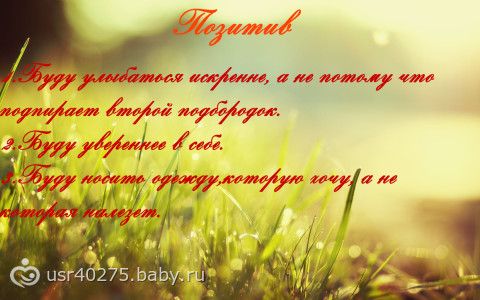 Позитив: я добью свой вес до 59 кг или даже меньше, подтяну свою кожу, избавлюсь от растяжек. моя самооценка взлетит до небес. я буду гордиться собой и излучать оптимизм. стану прекрасным примером для своих детей. муж будет любить меня еще больше, ведь я буду сильной и уверенной в себе к тому же еще и красивой, умной и с огромным жизненным опытом. ой, я прям сама себе уже нравлюсь))))