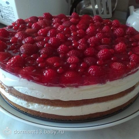 Делала мужу на 30-летие, все охали что огромный, но за 2 дня съели)) Бока делать красиво не умею, но на вкус не повлияло)) Бисквит с шоколадными каплями, крем чиз со взбитыми сливками и белым шоколадом и много ягод.
