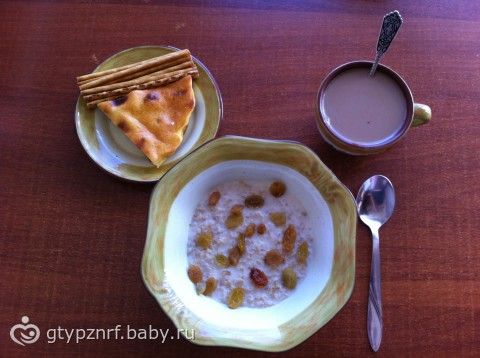 Завтрак: Каша овсяная на молоко-вода с изюмом(первый раз готовила без сахара, добавила соль, есть можно, но не вкусно), запеканка творожная, соломка сладкая(поделилась с сыном), кофе с молоком.