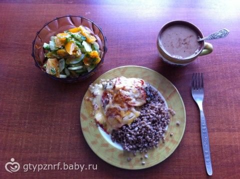 Обед: Курица под шубой(лук, базилик, томаты, майонез разведенный водой, сыр), греча, салат из огурцов и помидоров, кофе с молоком.