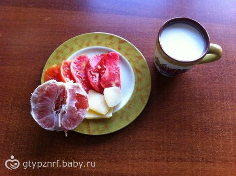 Ужин: Закваска 1%, 1/2 грейпфрута, сыр 17%, 1/4 томата.