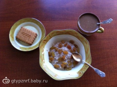 Завтрак: Каша из «остатков всех каш»(6 злаков+овсянка) на молоко-вода(сегодня и без соли) с изюмом, печенье с маслом, кофе с молоком.
