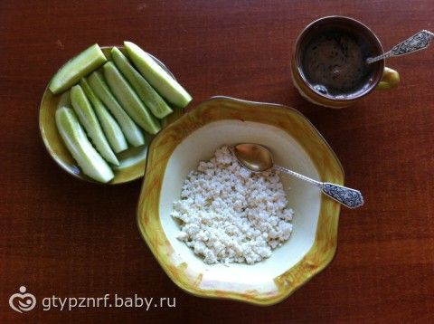 Ужин: творог 5%, огурец, кофе черный.