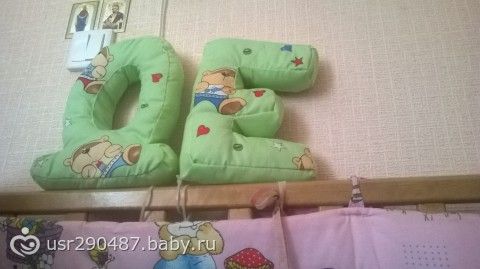 Смотрела я смотрела, весь интернет кипит этими буковками, и мне они безумно понравились. Сначала хотели с мужем купить их, а найти нигде не смогли, и я решила взять иголку и нитки в руки и самой сшить. Пока не закончила, но результат уже есть. Вот две готовые буковки. Они так классно смотрятся на кроватке: мило и уютно. И сынуле понравились. Первую буковку дошила, когда Демид спал, а проснувшись, он глаз от нее оторвать не мог: разглядывал, щупал, ну и, конечно, попробовал на вкус. В общем, вот первые плоды моего труда.
