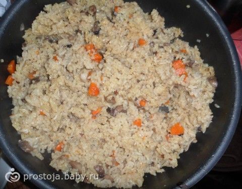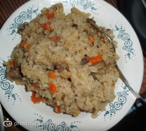 Ну это я малость перетомила его, отвлеклась на ребенка, обычно в мульте делаю, но тут подумала, что грибы надо основательно прожарить и готовила в сотейнике, а цвет из-за приправы для плова такой, на вкус-то он вкусный получился))