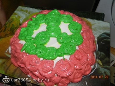 пекла для крестника, изначально хотела в виде цифры сделать, но не стала рисковать думаю первый раз и обычный сойдет)))))и еще шприц кондитерский старый, поломанный не удобно украшать было… вот теперь куплю себе шприц и буду эксперементировать!!! сам тортик вкусняшка!!!!