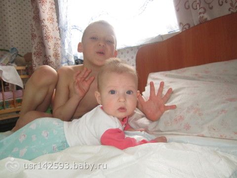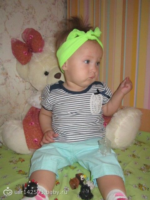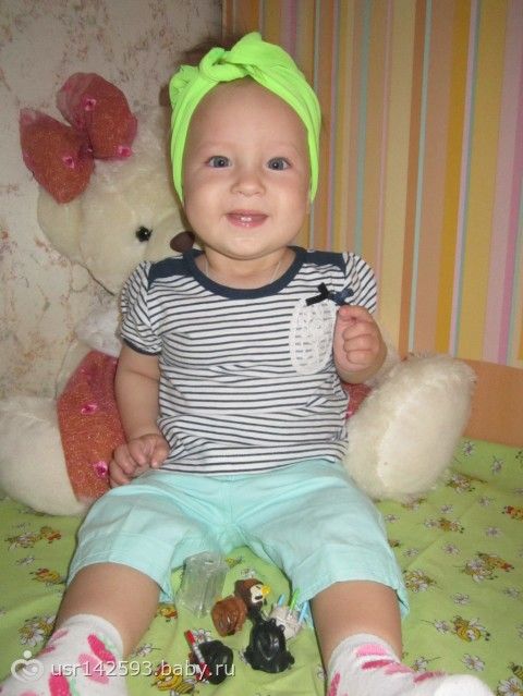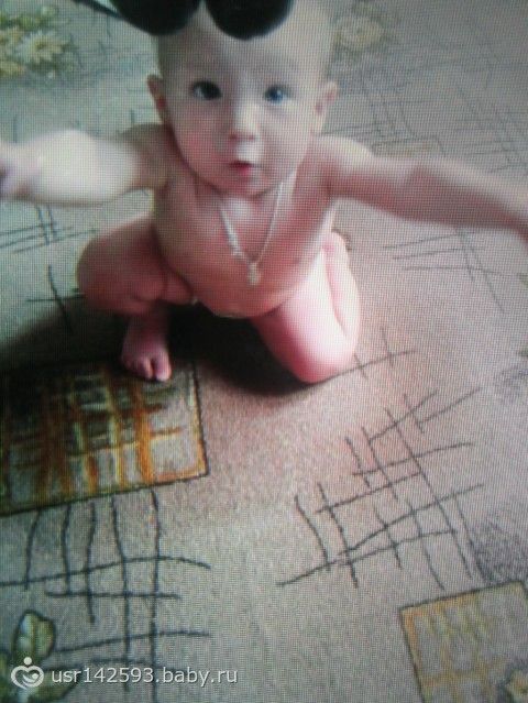 Итак нам 8 месяцев: мы умеем ползать, сидеть, стоять самостоятельно, ходить вдоль всего и везде) У нас три зубика, два снизу и один сверху( только почему то не те верхние что над нижними, а сбоку.) Режется еще три верхних. Температуры, плаксивости и проблем со стулом нет тьфу тьфу. Бусинка наша обожает музыку, сразу начинаеть вилять попой и дрыгать ногами. Говорим: ма, дадай( это типо дай дай, только она быстро это говорит), ахах( когда видит старшего брата). Машем ручкой пока, знаем слово нельзя( при этом она замирает в том движении при котором слышит нельзя