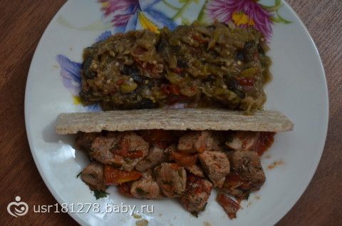Обед — тушеная индейка с луком и помидором, хлебец и тушеные овощи