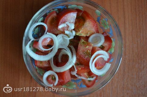 Полдник — помидор с луком и каплей оливкого масла и за кадром два куска сыра