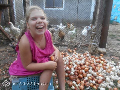 Ехали к маме помочь убрать лук, приехали и сразу на огород, а там травы не мерено и так вот с пятницы и до вторника простояла так сказать «раком» на огороде, все убрали, слава богу.Вика помогала и траву рвать и лук чистила со мной-помощница, без нее и не справилась бы.Гулять никуда и не ходили, в 9 вечера мама уже выгоняла с огорода.Сил хватало покупаться и где то протянуть ноги.Отдыхала я уже дома,2 дня не могла собрать себя в кучу.Отвыкла я уже от деревни, с 2000 года живу в городе, еще как то немного ездила к маме, а Вика родилась то уже не до деревни как то.И вот моя помощница