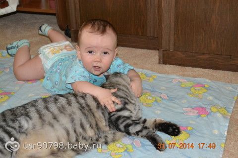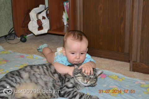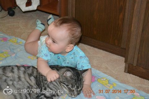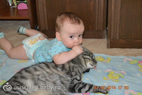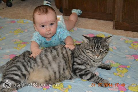 Кот все больше привыкает к малышу, уже воспринимает его более осознанно, но до сих пор ведет себя с ним немного настороженно и с высокомерием «старшего брата»))) Иногда!!! позволяя себя потрепать и вырвать из себя клок волос.