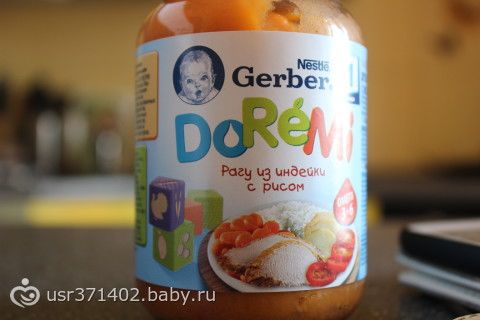 Прикорм мы вводили баночный, и с 9 месяцев готовлю сама, банки исключили полностью. Как то в дорогу взяла баночную еду и мой ребенок категорически от нее отказался, поэтому с этой баночкой думала что будет так же, нооо к моему удивлению ему понравилось. После первой ложечки сам с любопытством полез ложкой. В баночке было не в консистенции пюре, а в крупноизмельченном виде, рис цельный, морковь кубиками — в общем на удивление ему очень понравилось, теперь знаю что брать с собой в случае если надо в дороге покормить.