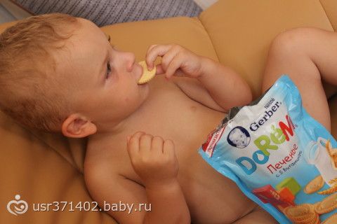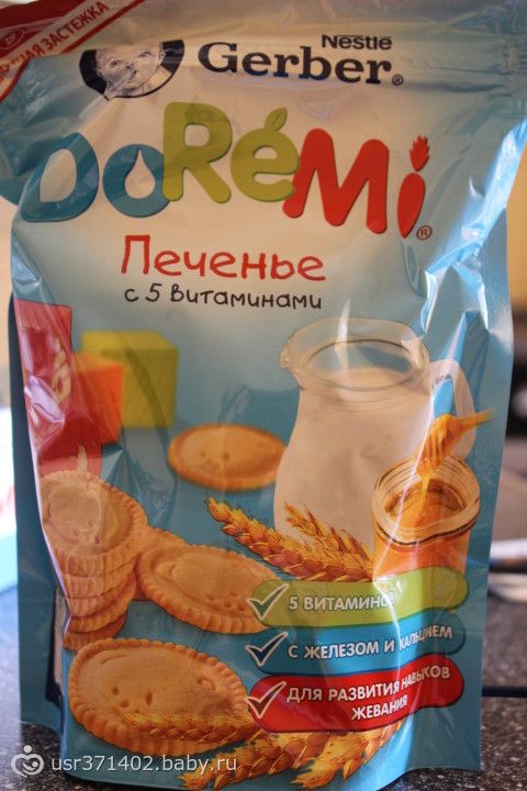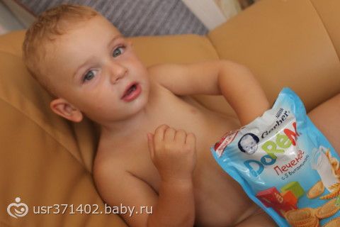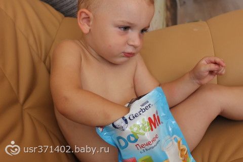Скажу сразу сын печенье очень любит, но опять же не все подряд. Запах у этого печенья прямо молочный, на вкус тоже очень чувствуется молочный вкус и они ооочень вкусные. Не рассыпаются. Опять же полно витаминов и огромный плюс — упаковка очень удобная, имеет силиконовую многоразовую застежку, которая очень плотно и надежно фиксирует пакет. Ну и естественно мой мальчик тут же туда залез, как только увидел эти вкусности