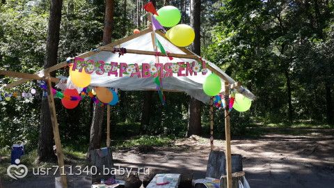 Отмечали в лесопарковой зоне, там есть беседки. Я проснулась рано-рано, что бы успеть занять беседку. В 7 утра я поехала на велосипеде на место торжества, была там примерно в 7:30, но уже к ээтому времени все классные беседки были заняты, пришлось искать просто место более менее подходящее, моему растройству не было предела. Нашла местечко, там был уже кем-то самодельный навесик. Ну пока я ждала свою подружку, которая меня должна была сменить, я начала украшать место торжества. Фотчки приложу) Пришла Моя подружка с малышом, она вместо меня осталась доукрашивать и ждать первых гостей, а я поехала собирать вещи, что-то нужно было докупить, а самое важное съездить к Янке и забрать ТОРТИК!!!