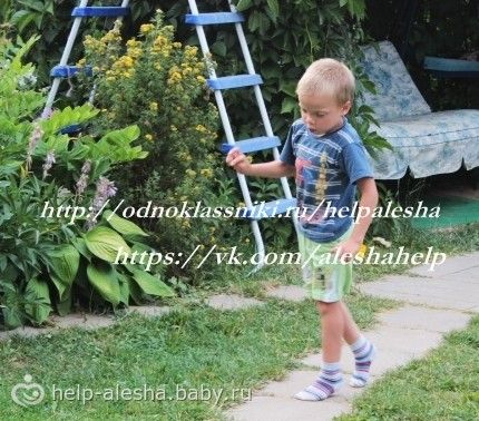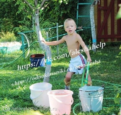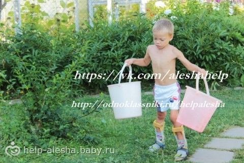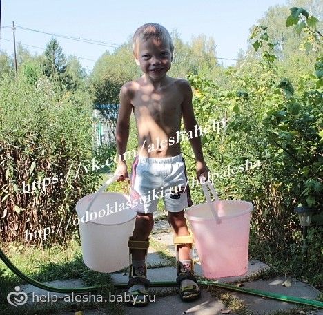 Алешка пока отдыхает, отсыпается, помогает нам во всем, за водой ходит, падает, кряхтит, ноооо старается тащит ведра, наливает сам воду, с бабушкой поливает огурцы, накрывает на стол, везде и всюду старается помочь))) Еще Алешка стал фантазером большим, вечно что то придумывает, шутит, очень интересный по вечерам поет нам частушки, песни и конечно же без танцев не обходится! А недавно бабушка закрывала огурцы, ну и наш непоседа подлетел, банка лопнула и кипятком ошпарило ногу… перепугались конечно все, но нет худа без добра, из-за ожога ортезы не смогли носить и уже полмесяца наш герой ходит босиком, вечером в сапожках самостоятельно)) сердце замирает когда вижу это и пишу о наших результатах… совсем недавно мечтала чтобы хоть малюсенький шажочек сделал сам… и какой стал сейчас!))) ортезики только вчера начали снова одевать, чтобы постановка стопы все же была правильной. Очень повзрослел, подрос, немного поправился, но еще все такой же худышка, вес как то не можем набрать побольше, но мышцы уже намного сильнее стали и крепче, для нас это очень важно.