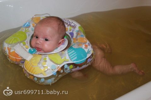 Примерно в полотора месяца начали купать его в большой ванне, в круге))))) Как ему нравится!!! Он такой довольный плавает)Ножками и ручками болтает) В общем, хорошо и удобно) Хотя, по началу я боялась его выпускать из рук даже в круге)))