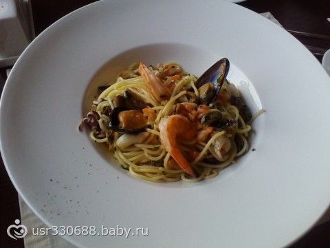 Потом нам принесли наконец-то наш обед :) Я заказала пасту с морепродуктами) Ноу комментс, на вкус божественно, а главное никакой запрещенной гадости) Все «легально» в рамках ПП )))