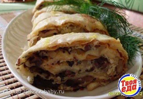 Запеченный рулет из лаваша с грибами и курицей можноподавать горячим или в остывшем в виде.