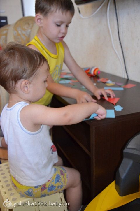 Из вырезанных геометрических фигур из цветного картона дети собирают домики, поезда, вазы с цветами… Младший учит цвет и формы. Старший всё это знает уже давно. Но играть им вместе интересно! Если заметили, от телевизора шнур торчит))) Это специально отключаем с мужем. А то старший может постоянно смотреть мультики, телек наш враг))) Нормы час не знает, выключишь, потом псих на него нападает. Решили, лучше вообще не включать)))