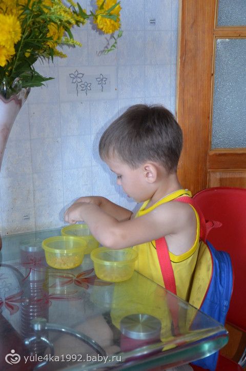 А вот Артёму, если дать всего две крупы, он одну всю выберет, а другую пересыпает в чашку. Смекалка уже работает! Задачу усложняем, даю ему 4-5 круп.