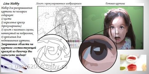 Нашла в интернете вот такие наборы рисования. Можно нарисовать красивую картину, не имея при этом специального художественного образования. Нужно всего навсего закрашивать области на картине соответствующей краской из приложенных баночек.