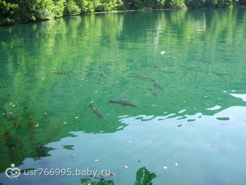 большие рыбы живут в озере. а вода зелено-голубого цвета!