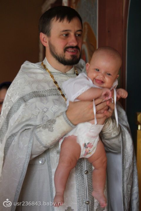 Вот и покрестили мы вчера 23.08.2014 Варюшу. Больше всех волновалось наша крестная. За неделю до крещения съездили с мужем и крестным на собеседование и записались на индивидуальные крестины. Все меня ругали, почему не общие, но уже после крещения я поняла:«хорошо, что никого не стала слушать.» Варюша на удивление не капризничала, хотя поспала до этого очень мало. Священник нам очень понравился, от него так и веяло теплотой; и он достаточно молодой-ему всего 30 лет.