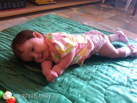 Нашему счастью уже три месяца. Целых три!!! Даже не верится. Вроде совсем не давно я ходила с пузиком, ощущала пиночки и икание. И вот наша маленькая принцесса улыбается и смеётся, когда видит маму или папу. За этот месяц мы научились ловко переворачиваться на животик со спины. Гулим и смеёмся, уже хотим сидеть, любим смотреть футбол и топ–модель. Кушаем по прежнему только мамино молочко, не признаем ни каких смесей. И растем хорошо, за месяц выросли на 4 см и поправились на 1100 г. Теперь наш вес 6700 и рост 63. Как же хорошо быть мамой!!! Люблю своих деток!
