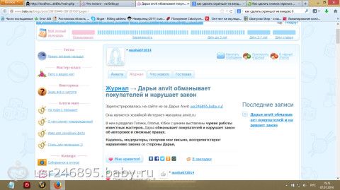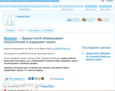 в общем она так же сидит на страна мам. я сделала заметку о ней на ее странице)))) но я то знаю кто она)) и знаю что она вязальщица) теперь со скринами мне будет легче) она барышня такая что много кого так пытается унизить или испортить репутацию) в общем о всех новостях буду вам сообщать) будем вместе смеяться)
