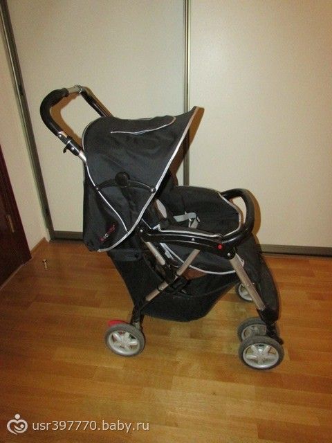 Спинку коляски можно опустить. Регулировка наклона имеет пять положений. Пятиточечные ремни безопасности, поворотные передние колеса с фиксацией. Перекладина перед ребенком, легко снимается. Вместительная сетчатая корзина для продуктов 2 смотровых окошка.Удобная ручка для перемещения коляски в сложенном состоянии. Вес коляски 8 кг. Хорошее состояние, если б не переезд никогда б не продала ее!