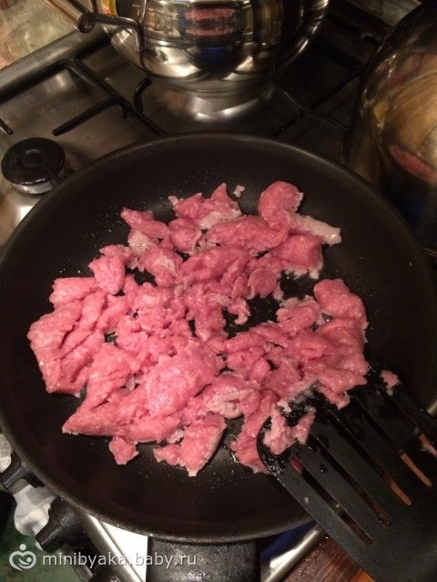 Выкладываем фарш на горячую сковороду с маслом, обжариваем до полуготовности минут 5-7.