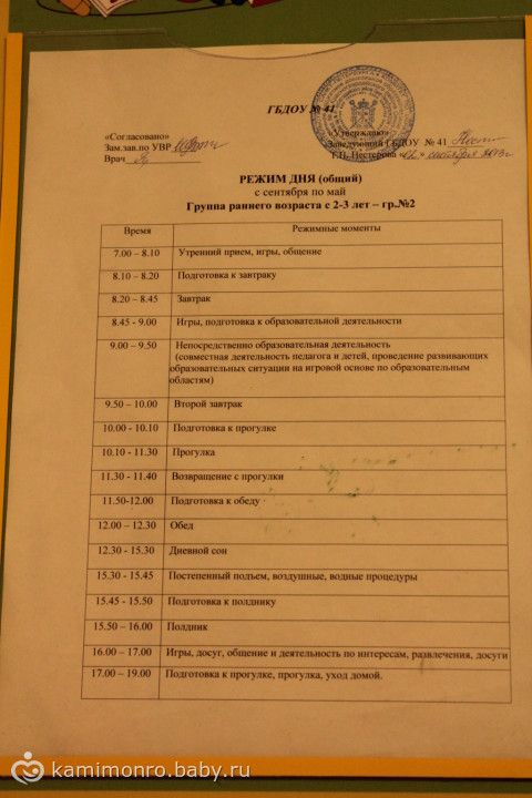 У нас почти такое же расписание, только занятия до 11-11,30, потом прогулка до 12,40, обед и спят они с 13 до 15( может просто то что постарше, не помню как они в яслях спали). Дальше так же, в 16 полдник, игры и в 17 гулять. Если дождь, то в группе сидят — рисуют, лепят и т.д.