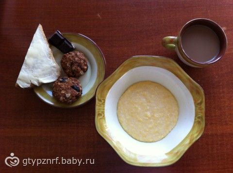 Завтрак: Каша кукурузная, бутерброд с плавленным сыром (муж с утра не съел, пришлось включить в свой рацион), горький шоколад, овсяное печенье ПП (одну съел ребенок), кофе с молоком.