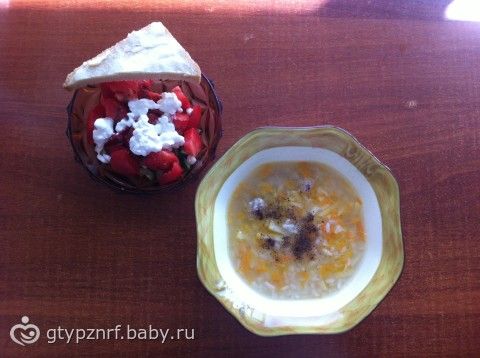 Обед: Суп с фрикадельками, бутерброд с плавленным сыром (доедала), салат из помидоров, и огурцов с зерненым творогом 5%.