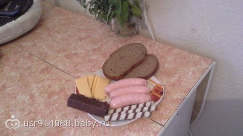 Завтрак сосиски, сыр, хлеб, чай сладкий и сладости