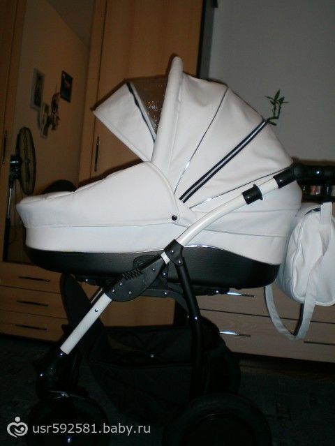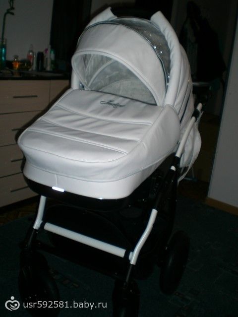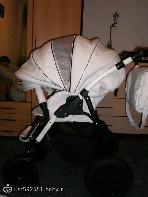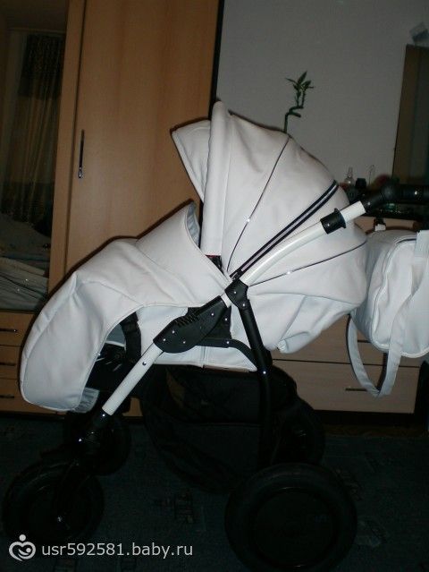 Приехали, а там еще ничего разобрать не успели. Меня проводили на склад и там я нашла ЕЕ!!! Красивая БЕЛАЯ! Из экокожи! В ней оказалось все ТО что я хотела!!! И колеса поворотные и крепления качественные, и полностью закрывается, что в зиму оч важно!2 в1!!! Автокресло нам по наследству передадут. Вообщем одни плюсы! Мужу тоже понравилась.