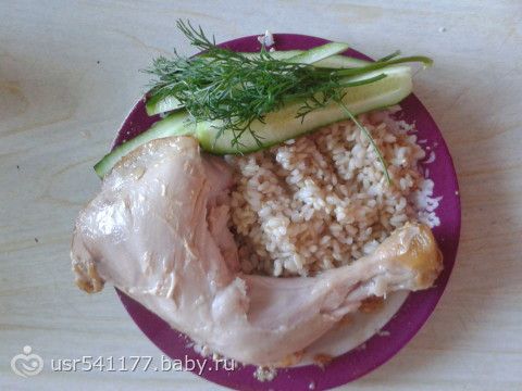 Обед: куриный окорочок запеченный, замаринованный в сметане, соевом соусе, карри. Почему-то в калоризаторе он такой жирный, наверно имеется в виду что он с кожей, бурый рис, огурец.