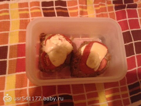 Ужин: котлеты из говяжьего фарша запеченый с помидором и сыром.