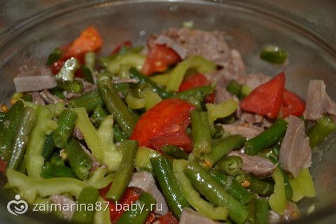 свиной язык, помидоры, стручковая фасоль(обжаренная или обжаренный зеленый горошек) чеснок и крымский лук(я не добавляла, так как не было) заправить масломОливье можно со сметаной сделать, и заменить майонез на сметану в других салатах. Рыбный с маслом тоже вкусный салат.