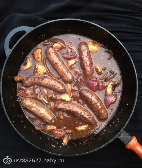 Обжариваем сосиски и откладываем в отдельную миску. Обжариваем бекон и лук, кладем обратно сосиски, добавляем вино, бульон и специи. Закрываем крышкой и оставляем на 40 минут на маленьком огне. Открываем крышку, добавляем грибы, перемешиваем и оставляем еще на 30 минут уже без крышки. Опять вытаскиваем сосиски. Масло перемешиваем с мукой и добавляем в соус. Добавляем варенье и хорошо перемешиваем. Оставляем на 3 минуты вариться, помешивая. Кладем обратно сосиски.