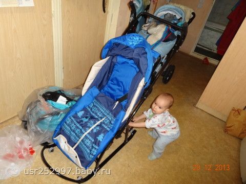 Ой, наврала, уже на 8 месяцев-годик брали. Плюсы санок-колясок (моих конкретно) — ремень безопасности, спинка раскладывается (но не до полностью лежачего положения, если в болоневом комбинезоне, потихоньку во время сна съезжал), теплый защитный чехол на ножки, защитная прозрачная клеенка — дождевик (пристегивается-снимается), ручка перекидывается, не очень легко но компактно складывается для перевозок. Есть и неудобство, когда везешь лицом к себе, если много снега — нижние штыри иногда в снегу застревают, что создает стопор.На фото видно, что нижняя рама не круговая и с одной стороны торчат штыри. Кстати, на фото — весь наш транспорт. Позади санок коляска 3- в -1 Tako-jumper X, в которой в итоге зиму и откатали, рядом слева от санок лежит прогулочная коляска Jetem Paris для прогулок по торговым центрам и летом по асфальту в городе. Tako jumper в прогулочном варианте на лето увозили в деревню — идеальный вариант для деревенского бездорожья, полей, лугов.