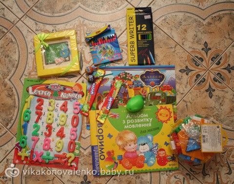 Вот это для сына (не все, т.к он все сразу не отдал)))) Там карандаши (обычные и восковые), альбом для рисования, цыфры на магнитах, альбом для развития речи, кубик-сортер, открытка-шоколадка, конфетки. Сладкое мы с мужем слопали, т.к. мелкому такого не даем) Альбом уже заштампил)