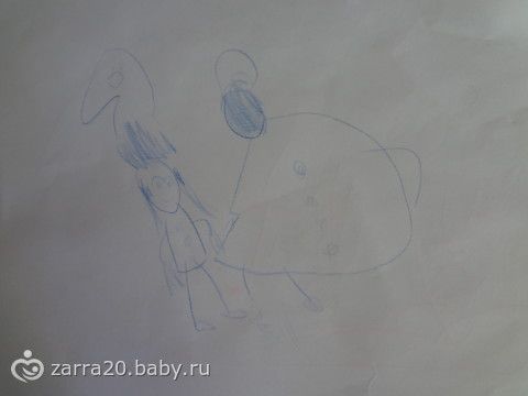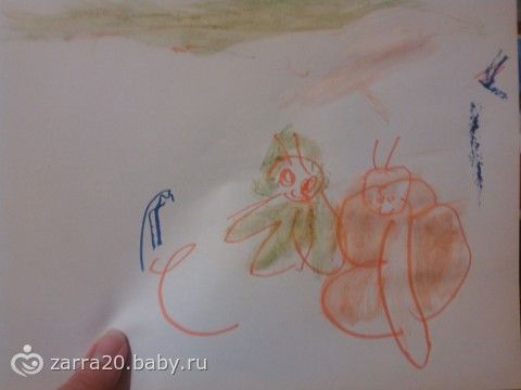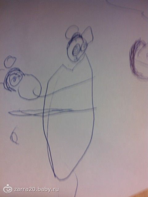 Еще было, нарисовала что то вроде овала и над овалом еще 2 овала вверх. на большом овале нарисовала «улыбочку», от этого овала с улыбочкой — палочки вниз(это типа ноги) и говорит «Это мистер Крабс»(говорит коряво)Со спанчБоба. Смотрю как то не очень похоже, отвечаю ну да на Крабса немного похоже. Лиза повертев рисунок свой, добавила дугу над овалами сверху, а в овалах(верхних) нарисовала точки и на большом овале еще кружочек(над улыбочкой) и вышла мордочка собаки(полосочки которые вниз были от овала(которые ноги), вдруг стали усиками собачки)))) Так интересно, просто она так быстро увидела «морду собаки» в этом «Мистере Крабсе»)))Жаль не успела сфотографировать((( Лиза увидела, что я покушаюсь повесить рисунок, и она быстро его забрала, найти не могу((