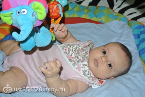 Моей бусинке уже 4… так быстро летит время, даже не успеваю насладиться ею, пока она совсем маленькая))) Мы много поем, что-то там болтаем на свои игрушки… Она улыбается и тянет ручки когда я говорю иди ко мне))) Это такое счастье, даже не описать…)) Даю ей фенхелевый чай один раз вечером, уже умеет держать бутылочку! А еще любит держать свои ножки))) Мы все конечно очень радуемся всем этим мелочам..)))) Весим мы в 4 месяца 7500, рост 65 см. Да, еще когда она засыпает на ночь, в 1-2 ночи я начинаю по ней скучать))) Днем же она спит 2-3 часа, просыпается и мы играем… вот так))) Любовь к своему ребенку поистине что-то волшебное!!!