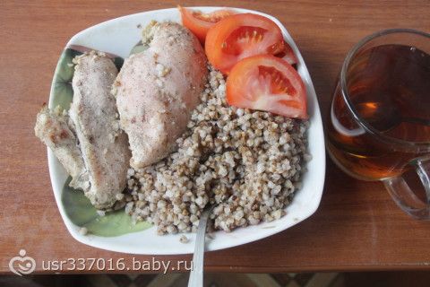 Обед: Греча, запечёная куриная грудка маринованая в кефире и специях на ночь, помидорка, наелась а то с утра голодная была.