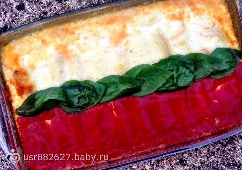 ОТВЕТ: Каннеллони с говядиной — итальянское блюдо. Трубочки из яичной пасты фаршированные мясом (болоньез в моем случае) под сырным соусом. Сверху половина украшена моццареллой а вторая половина пассатой (томатный соус с базиликом, чесноком, орегано и оливковым маслом). А листья это базилик