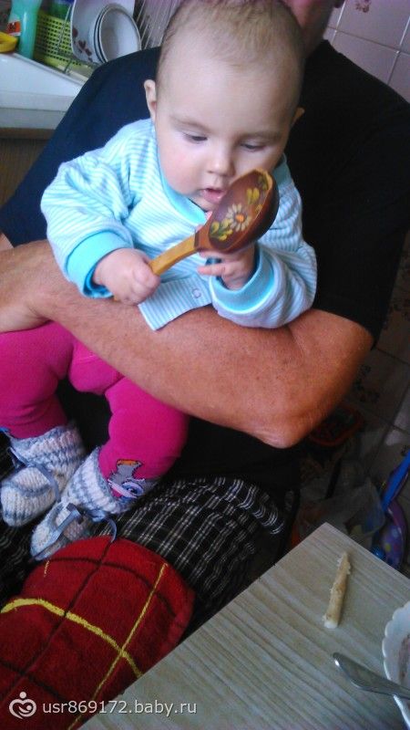 ну, это ложка, как же ее в рот не тащить!))) тренируется уже, скоро тарелку потребует)))