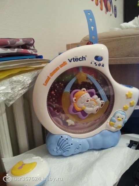 Там 40 мелодий,3 песни, звуки лягушек и природы.Есть диктофон и можно записывать свой голос для ребенка! Регулируется громкость.Всё это на пульте. Регулируется подсветка, проектор тоже.И эти мишки, что в центре, движутся, куча огоньков по бокам… Мигает и привлекает!