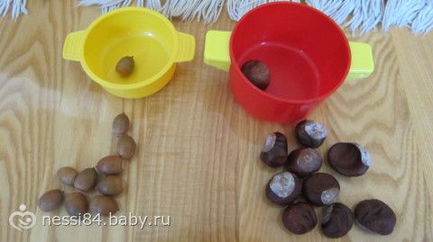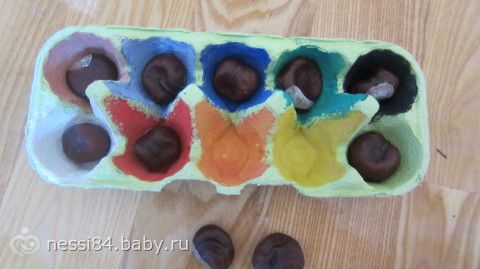 Раскладывали каштаны, жолуди, шишки по ячейкам. Я называла цвет ячейки и Полина туда ложила (с моей посказкой)