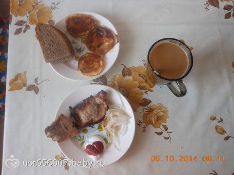 1,5 кусочка шашлыка(съела 1 через силу) с майонезом и кетчупом), 0,5 куска темного хлеба, 5 оладьев с медом, цикорий с молоком без сахара....